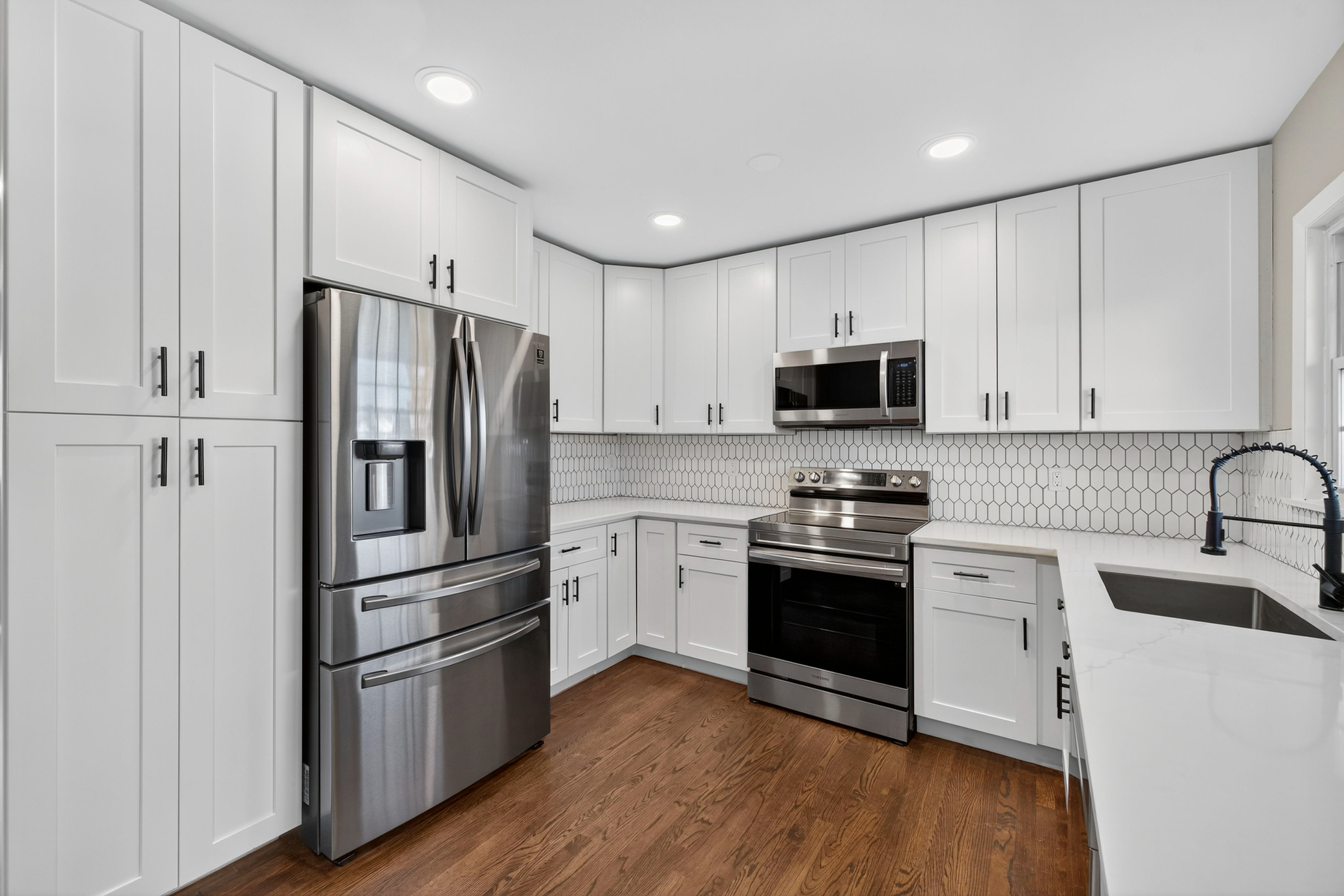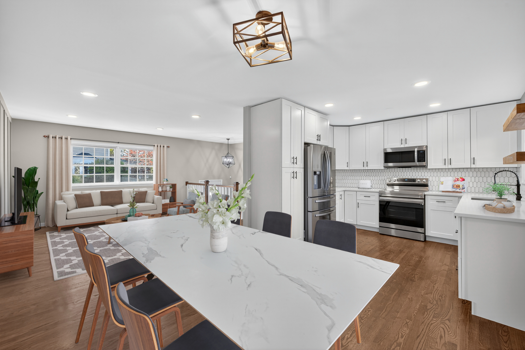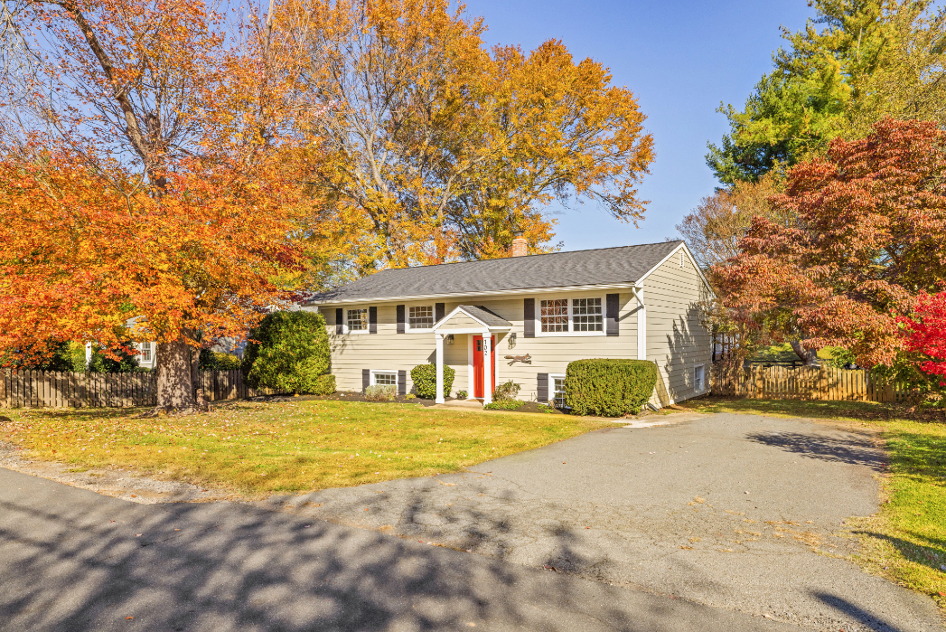 Renovated in 2021 the main level features a bright, open floorplan with beautiful hardwood floors and updated lighting throughout. The living room opens to the dining area and sunny kitchen with custom cabinets, stainless steel appliances, and quartz counters. Patio doors open onto a spacious, newly refurbished deck with stairs down to the backyard, perfect for entertaining friends and family. From the living area a hallway leads to the main bathroom, a cozy primary bedroom and two other bedrooms on this level.From the entrance foyer, stairs lead down to the fully finished lower level with laminate plank flooring and recessed lighting throughout. The flexible space offers a wet bar or efficiency kitchen, full bath, a fourth bedroom or office and utility room with washer and dryer. The spacious family room is filled with natural light and doors opening onto the covered patio and large fenced backyard.